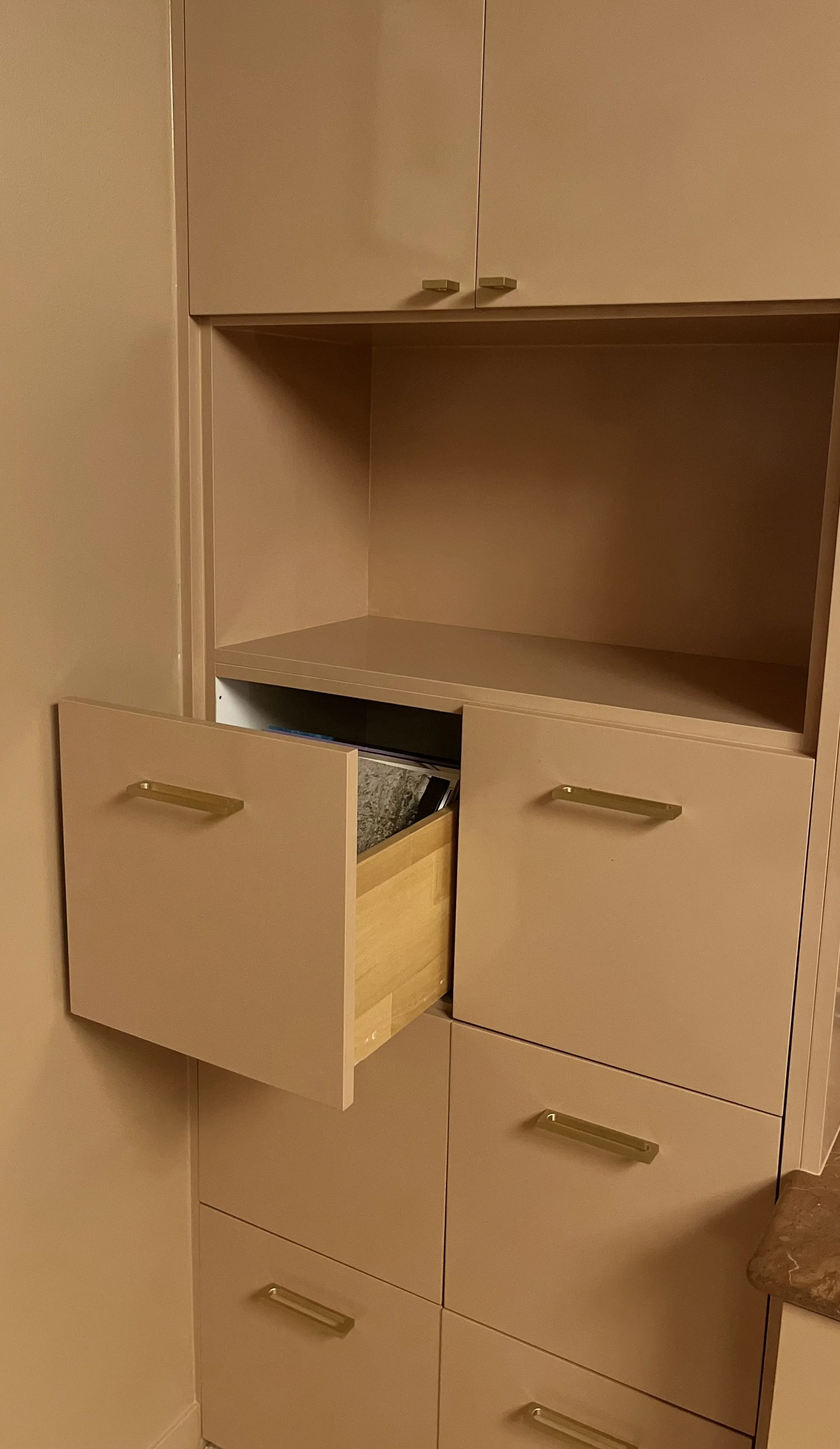 It’s top surface is precisely cut and joined to wrap around the existing column, blurring the line between where the space and cabinet start and end.
